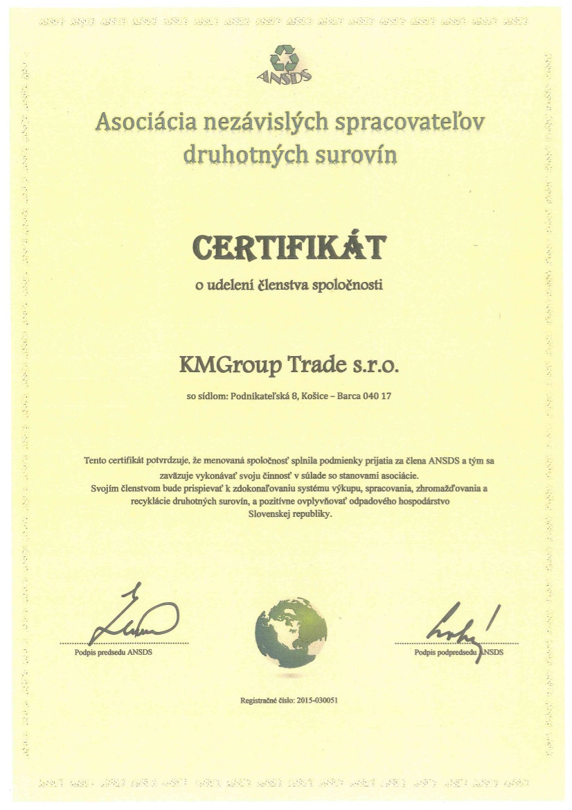 Spoločnosť KMGroup Trade s.r.o. sa v roku 2015 stala platným členom ANSDS ( asociácia nezávislých spracovateľov druhotných surovín)